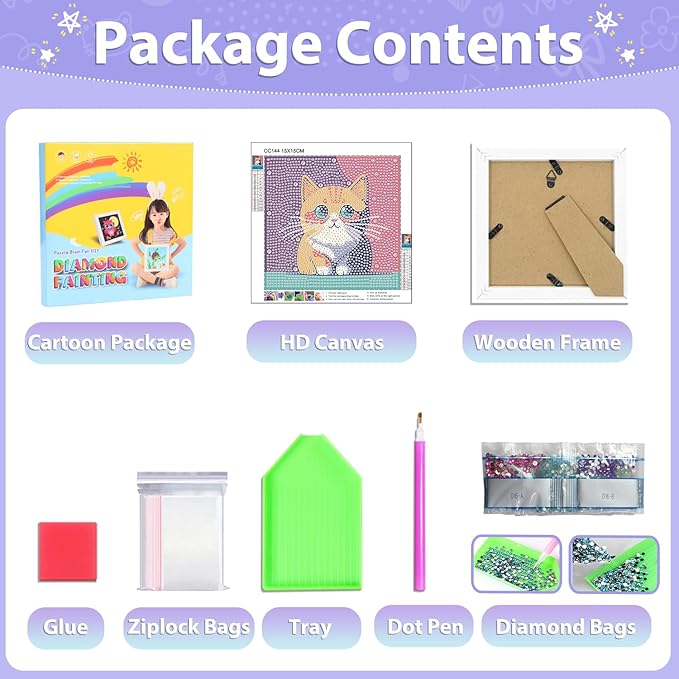- Diamond Art Painting Kits:Our diamond art uses high-quality rhinestones,rich colors,easy to operate,and the package includes:diamond canvas,diamond art frame,dot drill pen,tray and glue.You only need to click the number dot drill to complete the diamond art, which is very suitable for little artists to operate