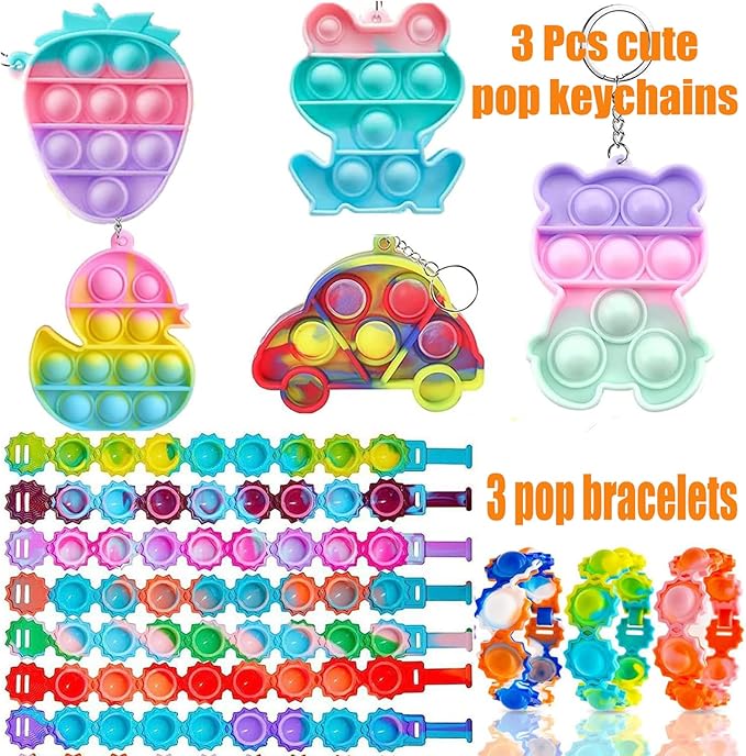 - 【124Pcs Party Favors Set】 The 124 pieces kids' party favor sets contains a rich variety of small toys that allow children to interact and play at parties, including: 2 animal pop keychains, 3 cute pop keychains, 3 pop bracelets, 6 mini pop keychains, 4 mini animal keychain, 60 Stickers, 10 slap bracelets, 6 mochi squishies, 6 sticky hands, 6 animal Pull Back Cars, 6 Tumbler, 6 Pull Back Planes, 6 mini skateboard.