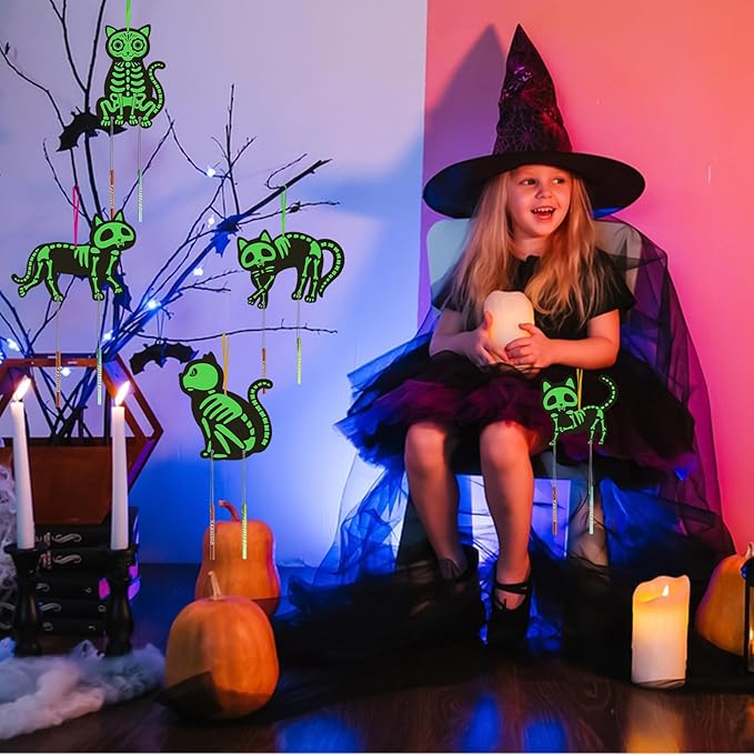 - Glow in The Dark Cat:DIY Paint color and glow in the dark paints on the unfinished wooden skeleton cat ,then go through the holes of wood chips and chime rods with a rope,and you will get a unique glow in the dark wind chime.These DIY wind chimes will sway with the wind made a joyful sound,glows skeleton cat vividly in the dark environmen. .Hanging wind chimes in the windows, doors and walls which emit more energy,a easy way to adding a terror Halloween atmospher .