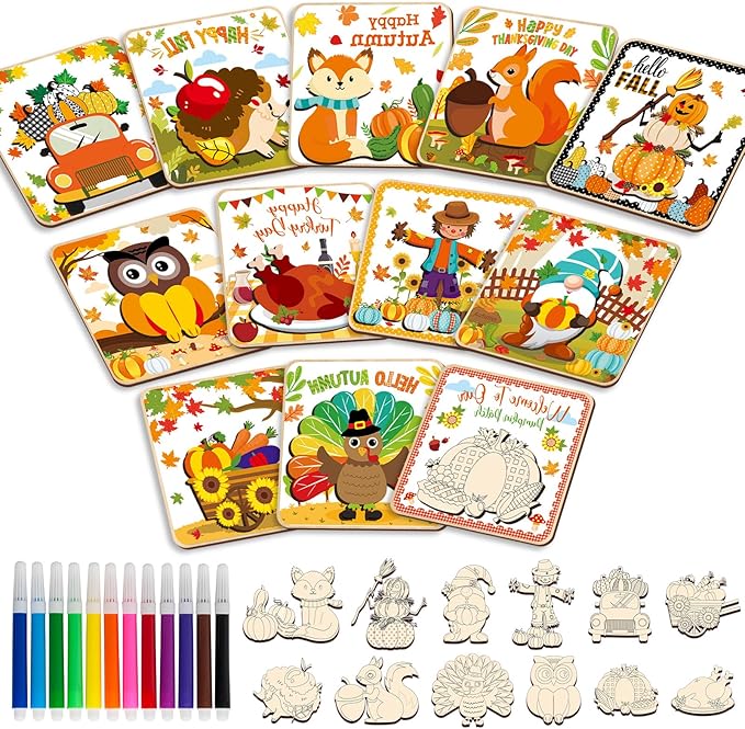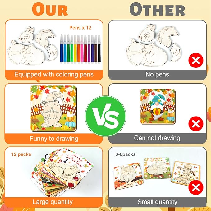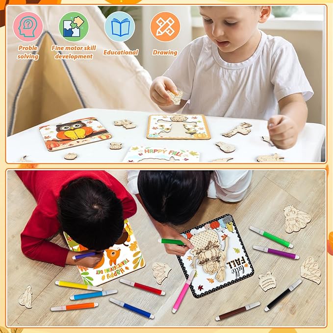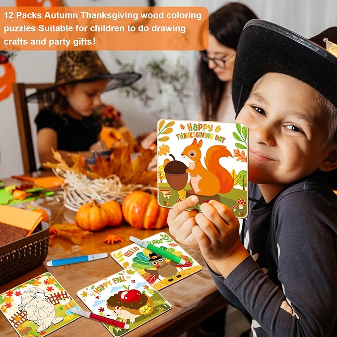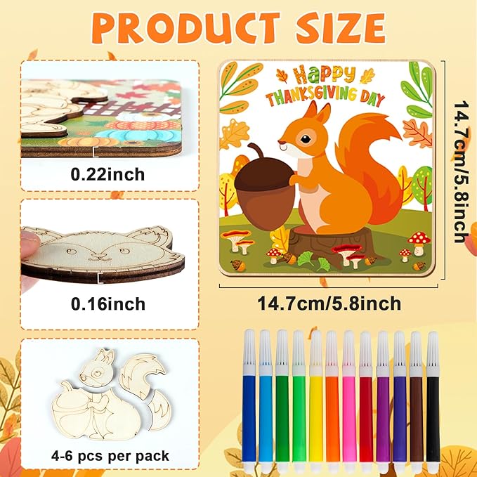 - Autumn wooden puzzles designed for kids: This Jigsaw Puzzle set for toddlers comprises 12 packs Thanksgiving Wooden Puzzles that effortlessly fit together, each board measures 14.7*14.7 cm/5.8*5.8 inches. All neatly packed in a vibrant box for easy storage with multiple coloring pens. Designed with squirrel, pumpkin, hedgehog, scarecrow, gnome, turkey patterns, this Happy Thanksgiving Day Puzzle can help improve your boys' and girls' create concentration and solve puzzles capacities.