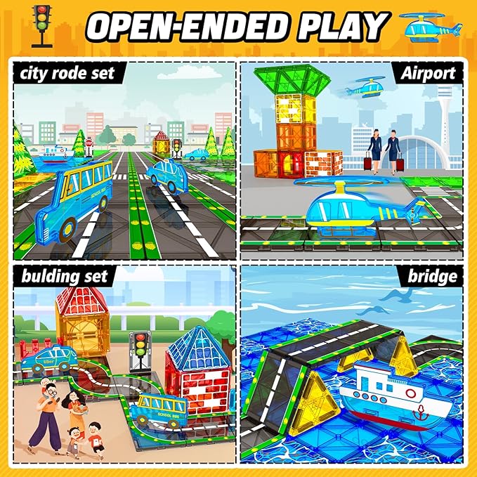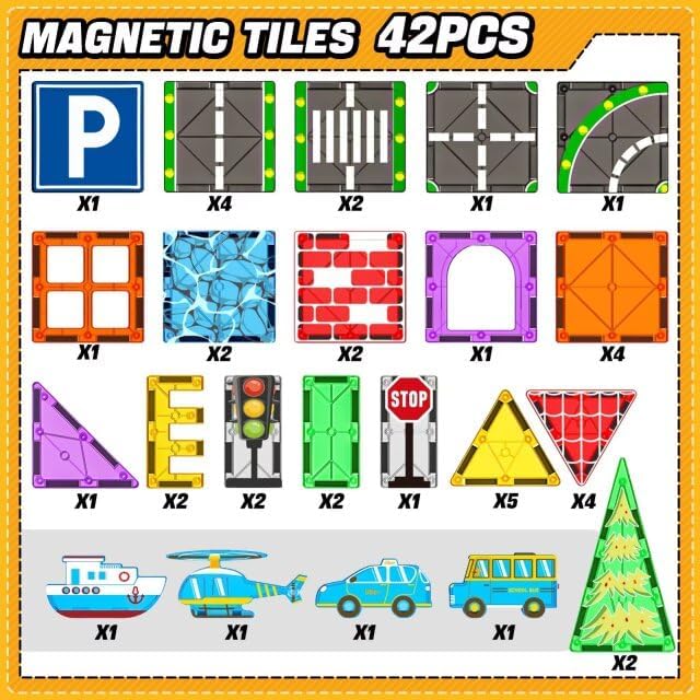 - 【Magnetic Tiles Road Cars Set】Let your kid's favorite car run freely! Our magnets for kids toys road set consists of 8 road magnetic tiles,4 vehicles(car, school bus, plane, boat),3 traffic lights,11 printing patterns magnet tiles, and 16 traditional tiles packing by gift box! Perfect magnetic blocks building toys for kids ages 4-8.