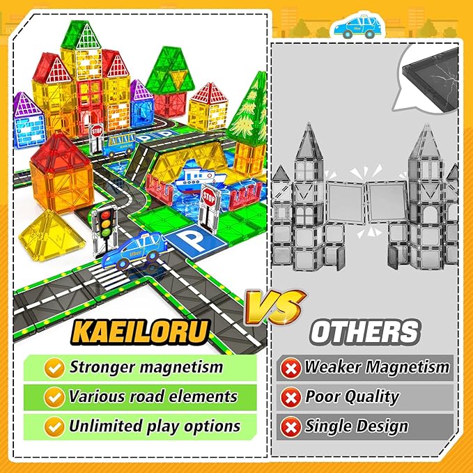 - 【Compatible Magnetic Blocks】KAEILORU magnetic tiles road set toys for 3 4 5 6 years old boys girls is designed with standard size make it compatible with major brands in markets.Making it a perfect addition to any magnetic blocks collection. it's durable magnetic tiles cars toys for toddler kids boys girls age 3-5 4-6 5-7 8-10 8-13.
