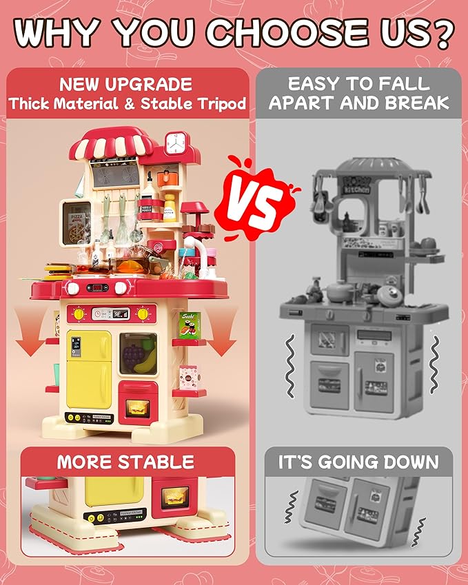 - 【NEW UPGRADE】The new kitchen playset toys uses higher quality materials, which not only surface is smooth and delicate, but also has a significant improvement in structure strength; New Tripods strengthen the design of the bottom support and solve the problem that is easy to turn over.