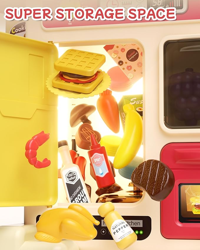 - 【Immersive Kitchen Play Experience】Dive into the world of cooking with this fantastic interactive toy kitchen set! Featuring a glowing electric stove, realistic cooking sounds, a running water sink, various toy foods, and kitchen accessories. Stay organized with ample storage including a refrigerator, oven and shelf.