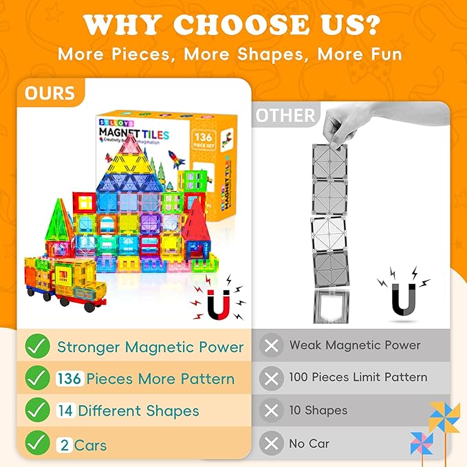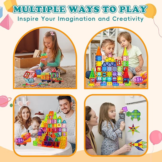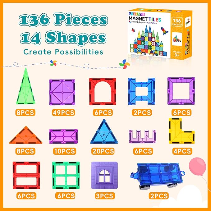 - 【136 Pcs Magnetic Tiles】Stlloys magnetic building blocks come with 136 vibrant pieces in various shapes. Kids can explore shapes from simple 2D patterns to intricate 3D structures, crafting anything from castles to vehicles. This set promotes imagination and is ideal for ages 4-8