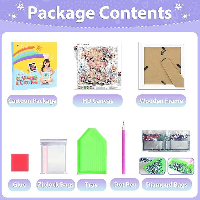 - Product Content:Our highland cow diamond painting for kids contains:1 diamond pen,1 tray,1 pack of colored beads,1 glue block,1 waterproof canvas,and 1 photo frame,these diamond painting kits are made of non-toxic materials,the glue that comes with the canvas is sticky,non-toxic and odorless,and can be used with confidence.