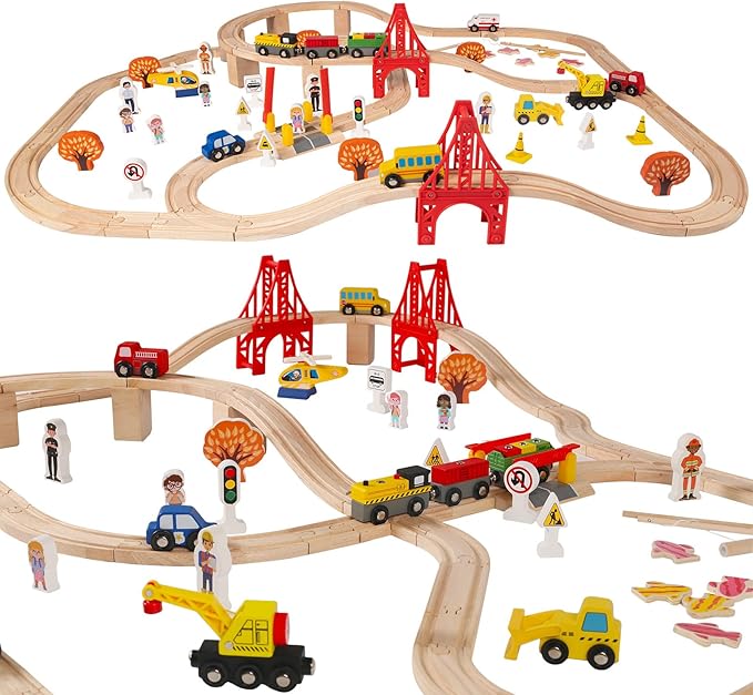 - 🚂【100PCS Wooden Bridge Train Track Set Perfect for Family & Party Time】This 100-piece set comes with wooden train tracks, scenario map including school, fire station, police station, farm, apron, construction site, sea beach, Bridge etc.This large-scale train set is appropriate for children aged 3 to 10, allowing them to experiment with various assembly method and enjoy a range of play options while fostering teamwork for up to three children. It is also the finest option for a fun family time.