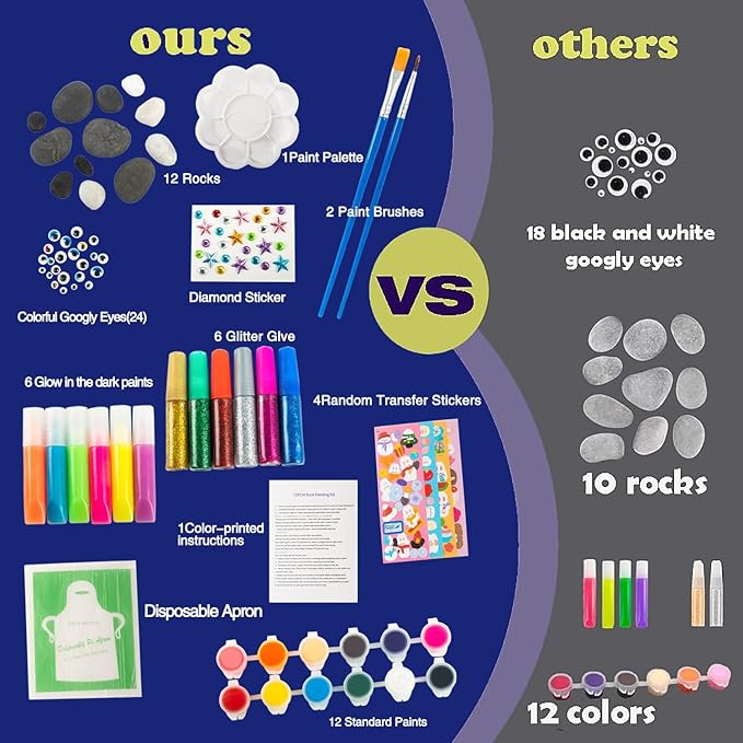 - VALUE ROCK PAINTING SET: Our deluxe rock painting set includes 12 premium rocks (sizes are four 3-5cm rocks, four 2-3cm rocks, four 1-2cm rocks), 12 styles of vinyl Paints, 6 glow-in-the-dark paints, 6 glitter glues, 2 painting brushes, 1 diamond sticker, 4 stickers, 12 black and white eye stickers, 12 color eye stickers, a paint palette and an instruction manual. This is a fun children's toy gift for boys and girls aged 6-12. Come and experience the fun of making beautiful luminous rocks!