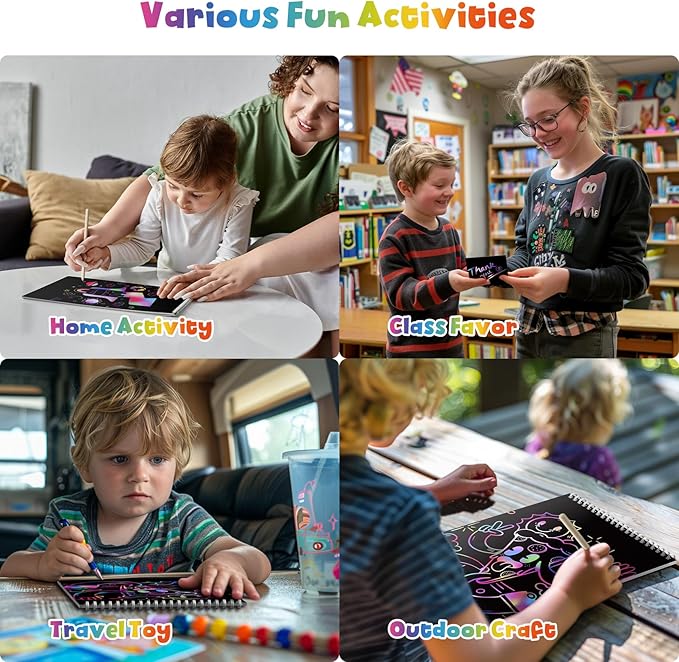 - Easy to Use: Simply scratch off the colorful coating with a stylus or tool to reveal vibrant rainbow patterns underneath