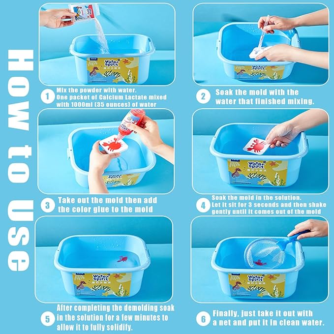 - Magic Water Elf Toy kits - With 4 Sea creature molds, 4 different colors of aqua gel(100ml/3.5ozper color), 2 packs calcium lactate powder, measuring cup, disposable gloves, paintbrush, colander, and instructions. Complete with the tools you need to get your project started, so you can start creating right away.