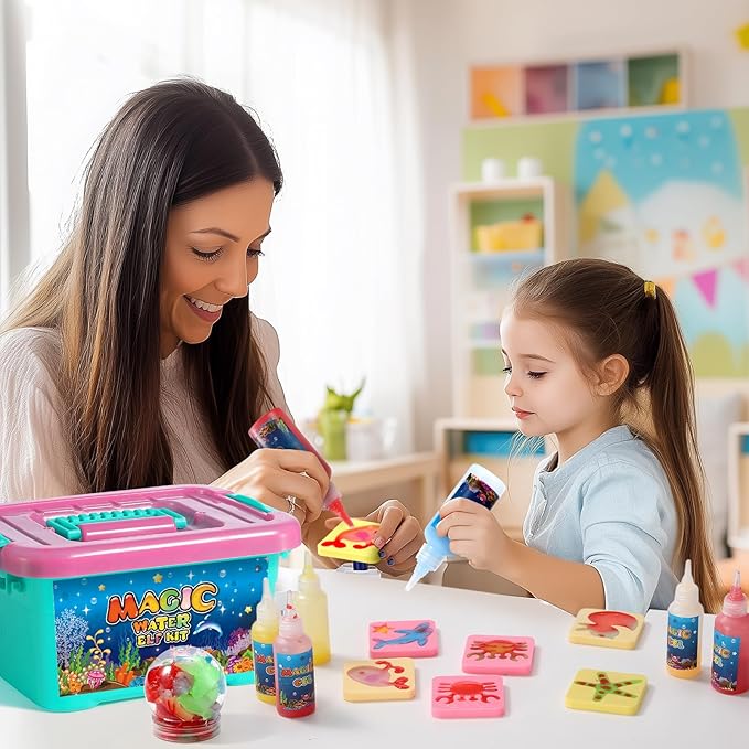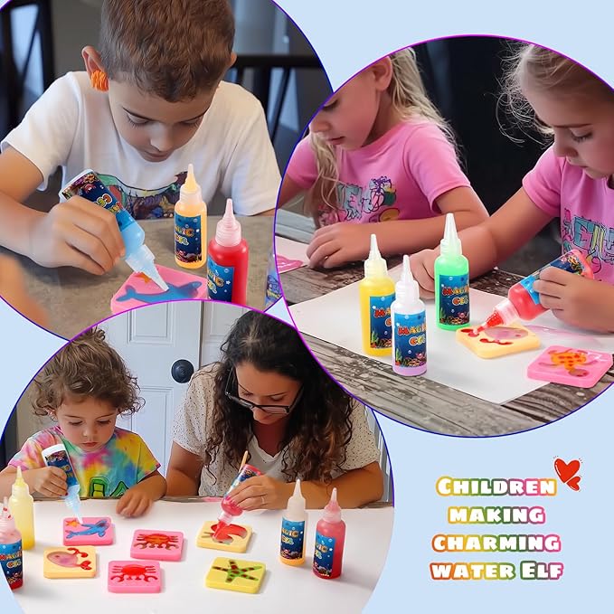 - This kit has everything that kids need to be able to make their own water gel toys. There are molds that you add, the color of your choice, with the magic gel and you can even add additional colors to make eyes, or a decorative effect on the shape mold. Then you add the mold, with the magic gel, into water to cure your mold until it releases and you have a new toy to do whatever you want with.Create Your Ocean World,Dive into creativity with our water gel kit. Let your child craft mesmerizing ocean elves and build a vivid aquatic world, These colors not only ignite the imagination enhancing your child's color recognition skills,Let them immerse themselves in the fun of DIY activities