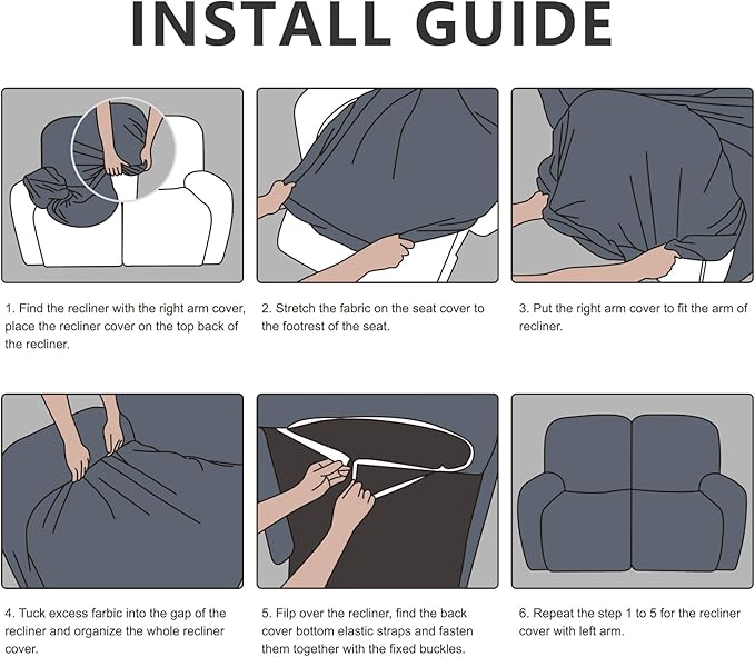 - EASY TO INSTALL: Our set of 6 recliner loveseat covers includes 2 backrest cover, 2 footrest cover, and right and left arm covers. Effortlessly install in just a few minutes with the guide paper included in the package