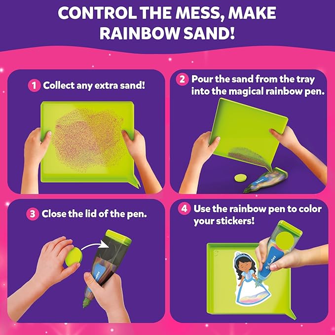 - SAND-TASTIC CREATIVE ART ACTIVITY: Bring over 50 stickers to life with colorful sand! Create stunning scenes of dazzling palaces, princesses, chariots, and more, sparking hours of imaginative play. The special tray and magical rainbow pen make crafting easy and endlessly fun!