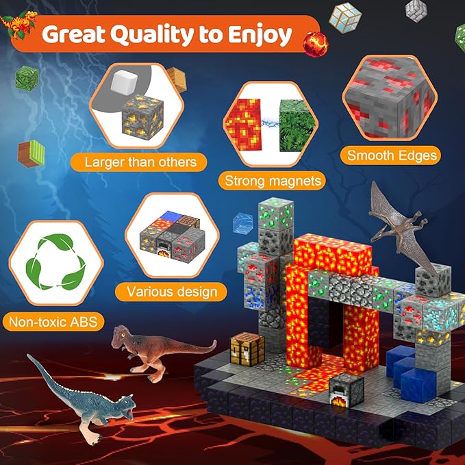 - Volcano THEME: Step into the magical world of dinosaur and volcano with our Magnetic Blocks set! This 110-piece set features vibrant magnetic blocks with 6 adorable ocean animals, sparking endless creativity and fun for kids.