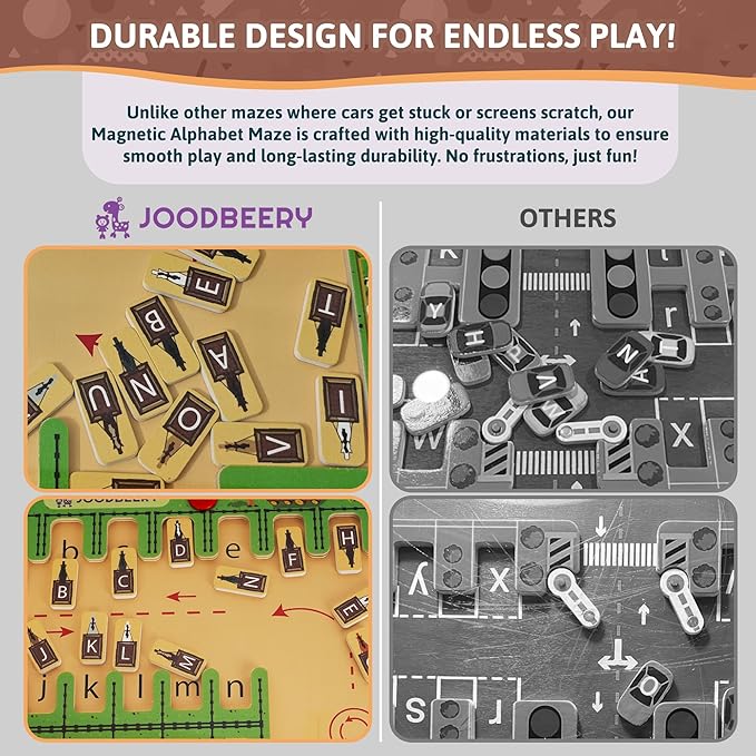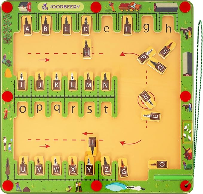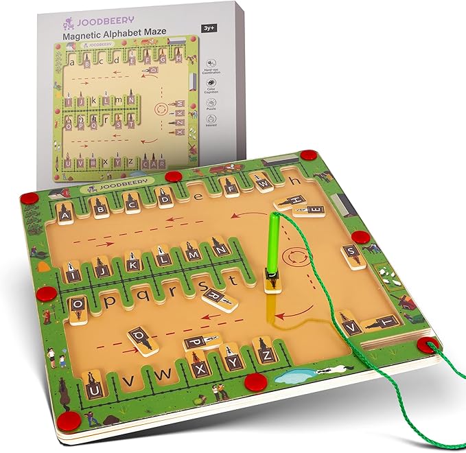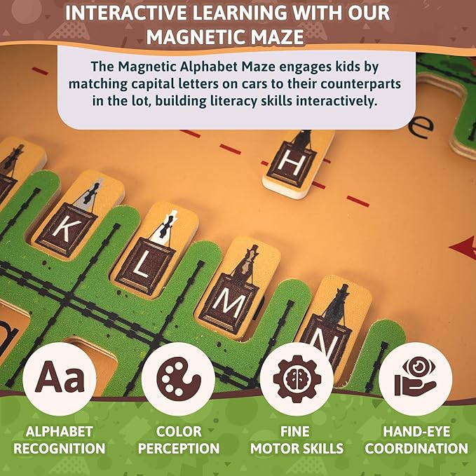 - Montessori Alphabet Parking Maze - Featuring colorful magnetic puzzles that park in letter slots, our magnetic maze board is an engaging puzzle for toddlers three, four, five, and six years old. Available in two fun themes!