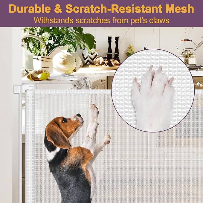 - Durable & Scratch-Resistant Mesh: Our extra tall retractable dog gate is made of upgraded mesh lining that is durable, soft and scratch resistant. It can withstand the scratching of your dog's paws.