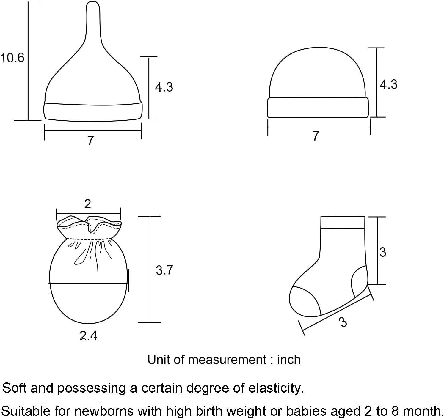 - Baby Hat Mittens Set Design Point 2: with a certain degree of thickness and elasticity, lightweight, soft and breathable, maintaining a warm and comfortable space for the baby. The shrinkable mittens and adjustable sock length can avoid slipping