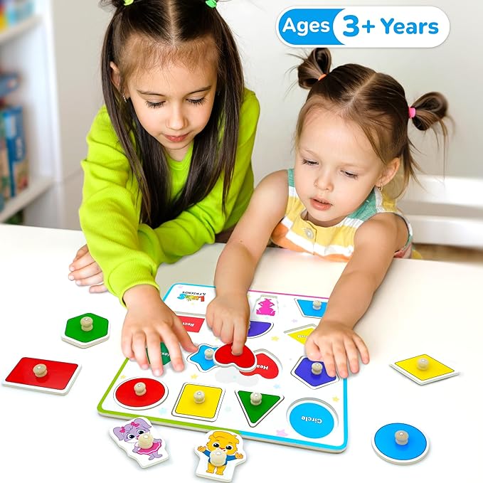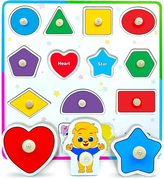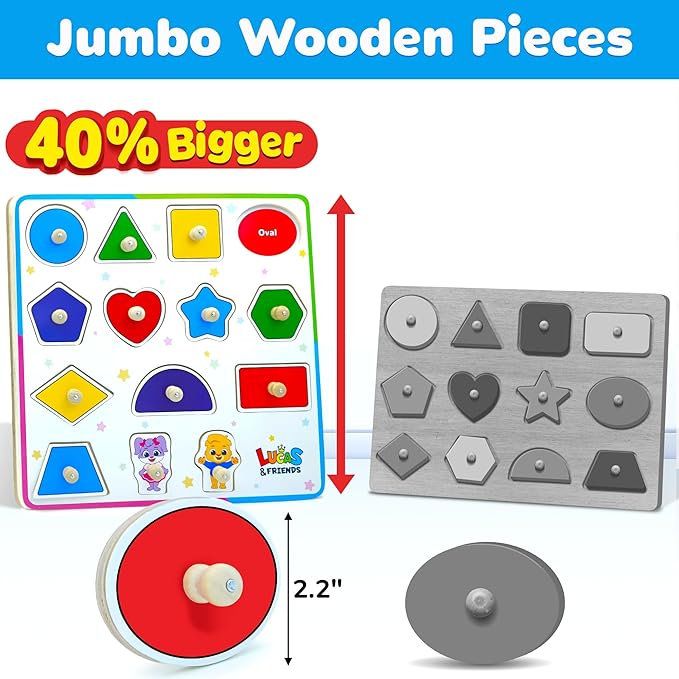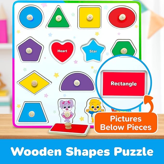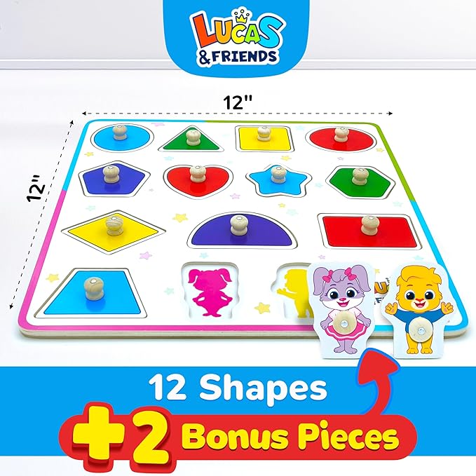 - EDUCATIONAL SHAPES PUZZLE: Introduce your child to a variety of shapes with this vibrant wooden peg puzzle. Shapes include circle, square, rectangle, pentagon, diamond, oval, star, triangle, hexagon, heart, and semi-circle, plus 4 bonus pieces featuring "Lucas and Friends" characters. Each piece has its name and a corresponding picture printed underneath, enhancing shape recognition and early reading skills for toddlers ages 3-5.