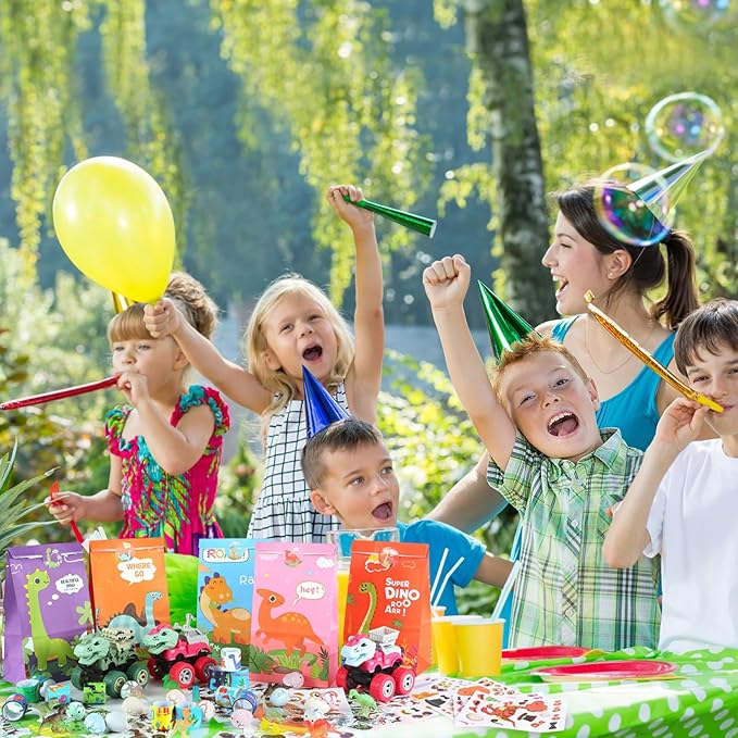 - Practical Application: These dinosaur pull back cars mini dinosaur toys and paper bags can be used at home, school, hotel, office and other occasions. Stickers and slap bracelets to keep your kids entertained at parties.