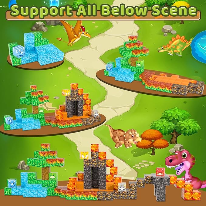 - 【DINOSAUR 3D WORLD-VOLCANO SET】 Dive into the dinosaur world of adventure with our magnetic cubes. Featuring 5 prehistoric dinosaur creatures that are all your kids' favorite, and designed with all the unique patterns blocks, covering different landscapes from forests to volcanic eruptions, perfect for creating epic dino battles and imaginative stories. Imagine the roar of a dinosaur taking you to an exciting world! Understand the evolution and embark on the adventure.