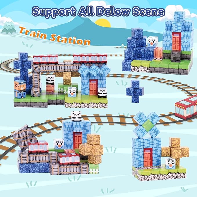 - Create 4 Dynamic Train Station Scenes:Bring the magic of a train station to life with this 100-piece magnetic cube set! Kids can design and build 4 creative scenes, featuring platforms, tracks, and other imaginative railway elements. Each scene encourages storytelling and role-playing, allowing children to explore their creativity as they craft vibrant train worlds filled with activity and adventure. The simple yet versatile design makes it perfect for endless configurations, inspiring hours of imaginative play.