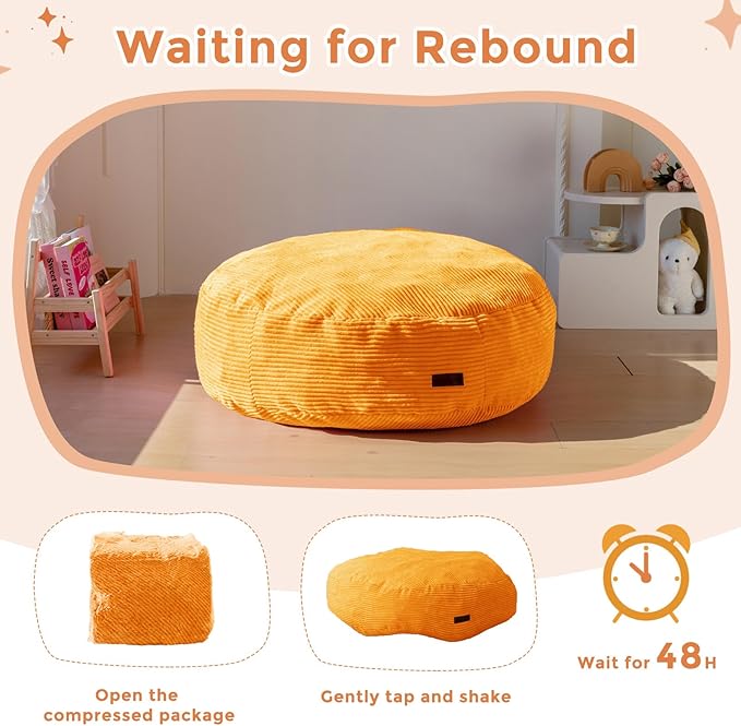 - Product Rebound: The pre-assembled bean bag bed is compressed during transportation and will expand rapidly once the package is opened. Please let it stand for 48 hours. When the foam filling has fully expanded, it will plump up evenly and return to its original state