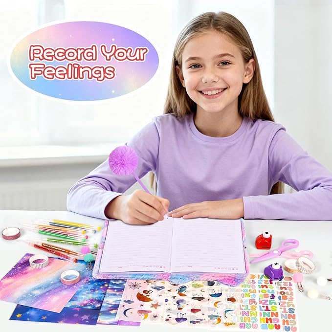 - Cute and Fun Diary Set: Our diary set includes plush diary, 12 sheet scrapbook paper, 6 letter sticker, 6 weather sticker, 3 butterfly sticker, 7 journal stencils, 9 journal pens, 1 pom pom pen, 15 washi tape set, 6 paper clip, 2 craft hole punch shapes and 1 safety scissors. They are packed in a cute box. It is a set of fluffy product kits that all girls love. It is the best gift you can give to girls.