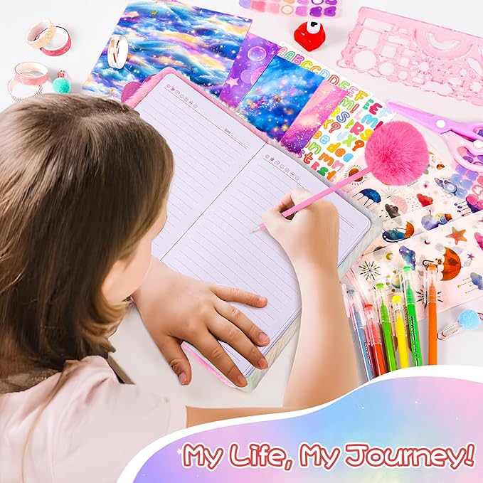 - Rich diary accessories: Our diary set offers you scrapbook paper with starry sky theme, letter stickers, weather stickers, butterfly stickers and washi tape sets. These accessories with different styles and themes can perfectly decorate your diary. journal stencils, paper clip, craft hole punch shapes and safety scissors, these manual tools provide efficient assistance for girls' planners.