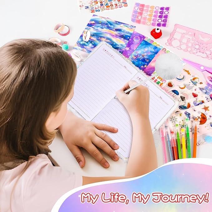 - Cute and Fun Diary Set: Our diary set includes plush diary, 12 sheet scrapbook paper, 6 letter sticker, 6 weather sticker, 3 butterfly sticker, 7 journal stencils, 9 journal pens, 1 pom pom pen, 15 washi tape set, 6 paper clip, 2 craft hole punch shapes and 1 safety scissors. They are packed in a cute box. It is a set of fluffy product kits that all girls love. It is the best gift you can give to girls.
