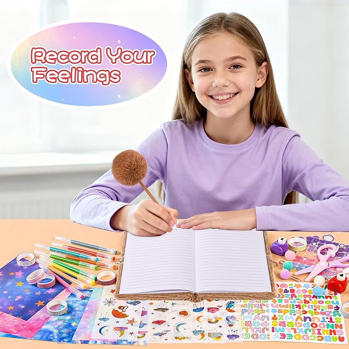 - Cute and Fun Diary Set: Our diary set includes plush diary, 12 sheet scrapbook paper, 6 letter sticker, 6 weather sticker, 3 butterfly sticker, 7 journal stencils, 9 journal pens, 1 pom pom pen, 15 washi tape set, 6 paper clip, 2 craft hole punch shapes and 1 safety scissors. They are packed in a cute box. It is a set of fluffy product kits that all girls love. It is the best gift you can give to girls.