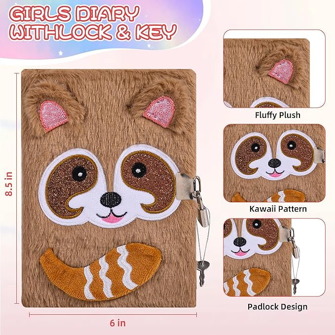 - Interesting Diary: Our raccoon diary comes with 1 metal lock and 2 keys to protect the girl's private thoughts and precious memories. It also includes a plush pen that a soft and comfortable plush ball on top of the ballpoint pen. While keeping a diary, you can relax.